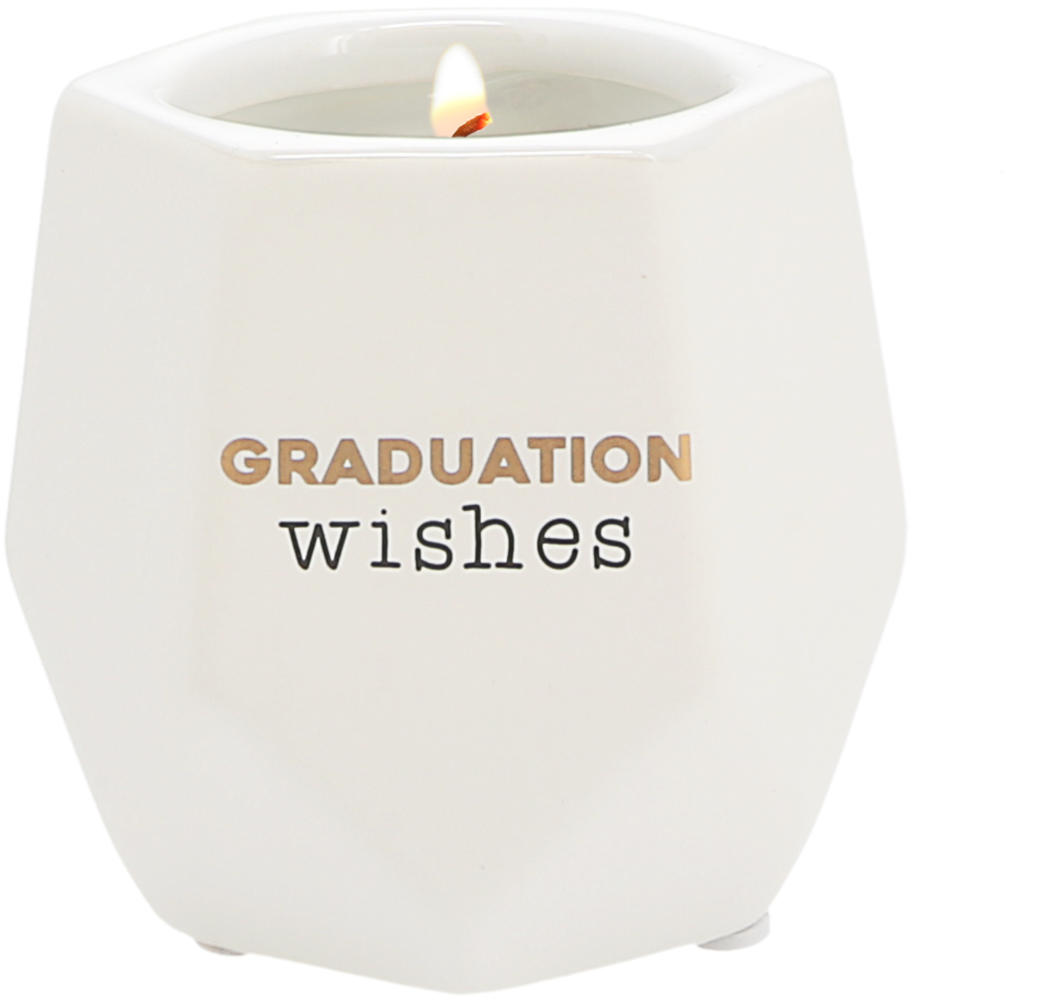 - IN-HOUSE DESIGN: Gold metallic & glossy black "Graduation Wishes" sentiment lines the front center of the geometric candle, which has a six-sided hexagon on the upper two-thirds and a twelve-sided one-third bottom. Always remember to trim your wick down after each burn and burn your candle to the outside for continual even burn.